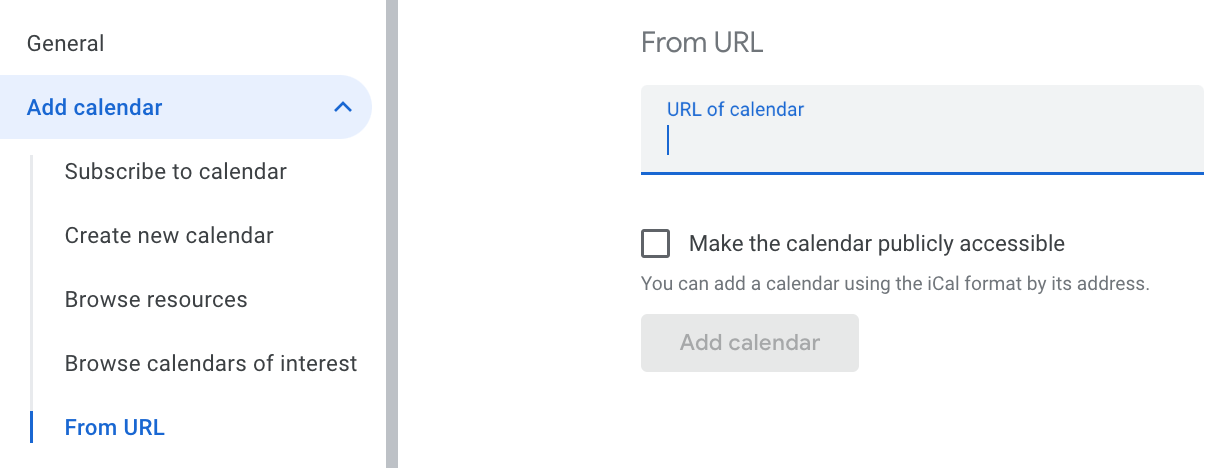 - 2. When 'From URL' is selected the following screen appears (for Google Calendar)