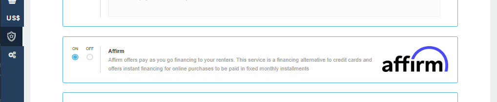 - selecting On under Affirm
