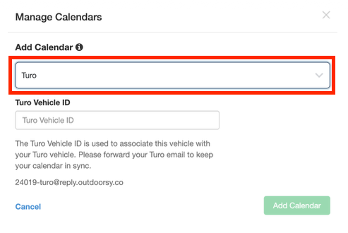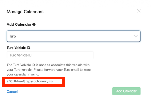Enter the associated Turo Vehicle ID. On a Turo listing page, it can be found at the end of the URL. Click Add Calendar.