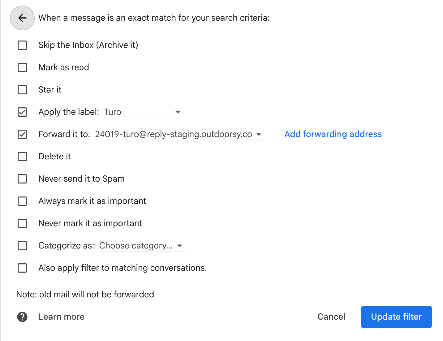 If you don't see Turo messages appearing in your Outdoorsy account within 24 hours, revisit the "Forwarding and POP/IMAP" tab to ensure the forwarding address is "Verified."