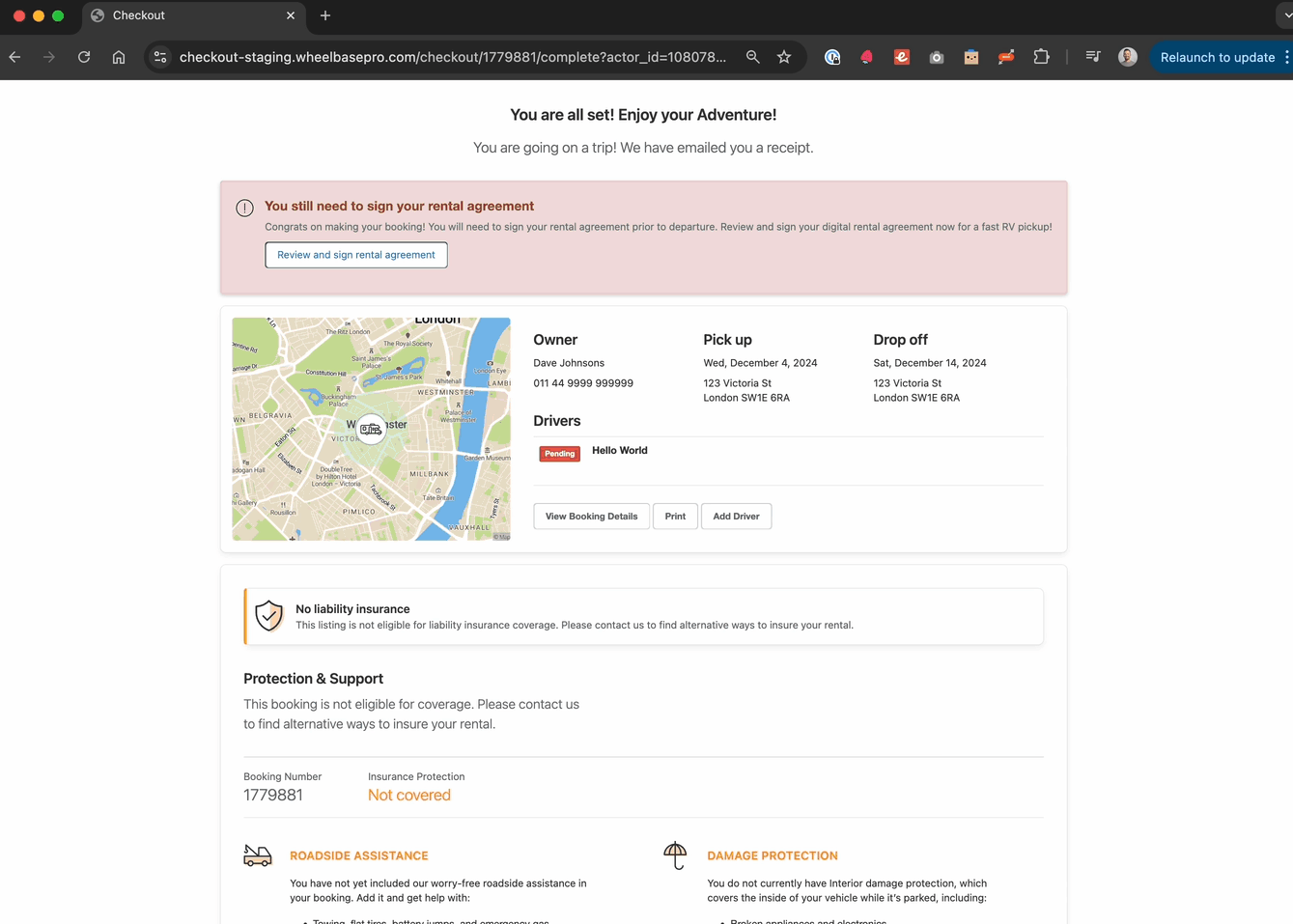 - Vous verrez le statut de la signature d'une réservation sur la page de cette réservation dans Wheelbase :