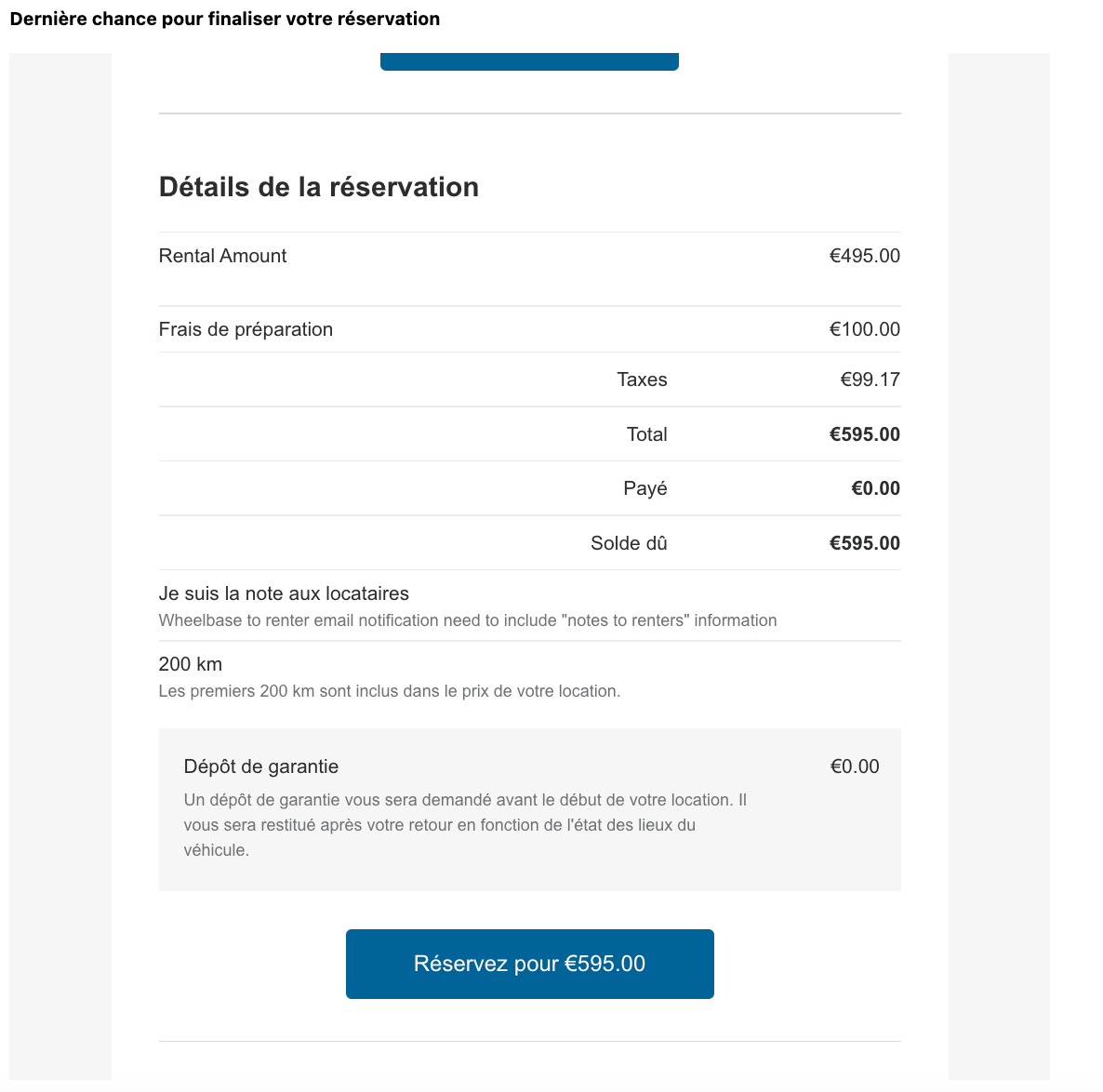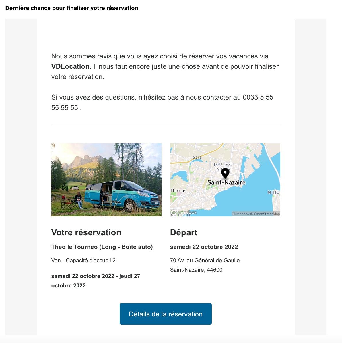 C'est un excellent moyen de rappeler à votre locataire des choses comme le paiement à venir, la vérification du conducteur, ou toute autre information qu'il doit recevoir avant, pendant ou après le voyage.