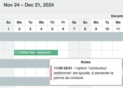 Le calendrier affiche désormais les notes sur les réservations, de la même manière que les blocs indisponibles affichent la raison de l’indisponibilité de véhicule. Nous avons pris en compte que vous utilisez les notes comme des rappels ou des moyens de faire apparaître des informations personnalisées sur la livraison de véhicule, les changements de départ et de retour, et bien plus encore. Ces notes sur les réservations ne sont pas destinées aux clients.
